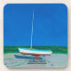 A painting of a single sailboat in a boat yard on a late spring day with a deep blue sky in the background. The artwork is about waiting for summer to start in New England and the fun on the water that comes with living in a coastal town.