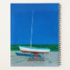 A painting of a single sailboat in a boat yard on a late spring day with a deep blue sky in the background. The artwork is about waiting for summer to start in New England and the fun on the water that comes with living in a coastal town.