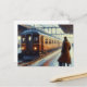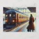 A figure in a brown coat stands on a train platform, gazing at an approaching train under a covered structure. The scene is characterized by a dynamic, swirling pattern.