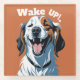 This delightful and vibrant design showcases a beaming dog with its eyes closed, clearly enjoying the moment, beneath bold white text that reads "Wake Up!" The design uses a playful mix of warm and cool tones, featuring shades of deep orange, white, black, and brown, giving it a cheerful yet cozy feel. The dog’s joyful expression, with a wide-open mouth and smiling eyes, captures the carefree and infectious energy that only our furry friends can offer.