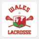 Lacrosse. Flag shield design with crossed sticks. Designs available in both regular and weathered, vintage-style versions. Wales lacrosse.