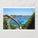 A beautiful scenic view at the top of the hill, before walking down to the picturesque beach in Menorca, Spain. This is one of the Balearic Islands. Clear blue water, green leaves, and a sunny sky!