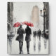 Great looking standing plaque picture, with a watercolor print of a rainy street, with a couple walking with red umbrellas.