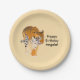 Digital painting of a walking tiger, with a placeholder for a name, with Happy Birthday, is printed on paper plates.
