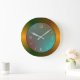 A simplistic engaging kitchen clock with reflects of gold. A round centre with aqua green and hints of red.A fine black border with black hands compliment the design. Available in round and square shapes.