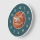 Large round call clock with dark, faux leather-style image for the background. The design features a large basketball placed on this background and overlaid with a name. The name is easily changed with the template. Selecting “Personalize this design” offers you several edit options to easily change the text (wording, plus type font, color, size, position) and to edit the design elements. You may also want to scroll down to the section “Transfer design to a product” for a few suggestions about other items this design can be used on.