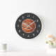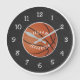 Large round call clock with dark, faux leather-style image for the background. The design features a large basketball placed on this background and overlaid with a name. The name is easily changed with the template. Selecting “Personalize this design” offers you several edit options to easily change the text (wording, plus type font, color, size, position) and to edit the design elements. You may also want to scroll down to the section “Transfer design to a product” for a few suggestions about other items this design can be used on.