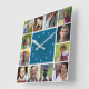 A colorful wall clock with 12 personal photos placed around the clock face of a dark color. The photos are easily replaced with you own by using the template.