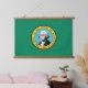 Crafted with meticulous attention to detail, this wall tapestry is more than just a decorative piece; it's a celebration of Washington's natural beauty and cultural heritage. The design prominently features George Washington's profile in the centre, surrounded by a green background with a state seal and yellow text that reads "The Seal of the State of Washington 1889."