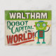 A funny Waltham Massachusetts vintage travel design featuring a friendly robot with fun retro style text that says, "Waltham, Robot Capital of the world!"