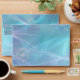 A pastel winter fractal scene like snow flurries blowing in the wind. But there's nothing cold or uninviting about this snowstorm. Soft white flakes appear scattered against the swirling sky blue and lavender. Accenting the piece is a silver filigree snowflake studded with jewels and pearls. Sparkling white diamonds, pale blue and pink heart shaped gems, and lavender-tinted pearls twinkle at the viewer.