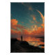 A solitary figure stands on a rocky outcrop overlooking calm waves, dwarfed by an enormous glowing crescent moon that fills the sky with soft luminescence. Dense stars sparkle across deep teal and indigo, blending into vibrant orange, rose, and golden clouds along the horizon where the last light of day lingers. Gentle surf reflects molten hues in rippled amber and crimson, creating perfect symmetry between earth and cosmos. The scene radiates profound solitude, cosmic wonder, quiet introspection, the threshold between day and night, and the sublime beauty of standing small before the infinite—perfect for meditation rooms, bedrooms, home offices, therapy spaces, modern minimalist decor, or as deeply symbolic gifts for dreamers, spiritual seekers, night-sky lovers, or anyone embracing personal reflection, awe, and quiet courage.