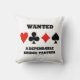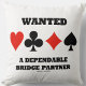 Showcase your wry bridge / duplicate bridge player side with this throw pillow featuring the four card suits along with the saying "Wanted A Dependable Bridge Partner".