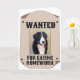 This fun greeting card is ready to be customized with a photo of your dog (or any other pet) and is in the style of old fashioned western wanted poster with the text WANTED FOR EATING HOMEWORK. The message on the inside can be customized with your own text.