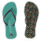 This colourful pattern of dots will bring a smile to your face every day. How can they not; they look a little like floating gumballs! This mismatched pair of flip-flops is extra fun. The right shoe has the dot pattern repeating on a black background. The left shoe is teal with your name running up it.