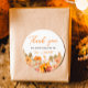 Celebrate the cozy charm of autumn with our Warm Boho Little Pumpkin Fall Baby Shower thank you stickers! This gender-neutral design showcases a beautifully hand-painted floral wreath intertwined with rustic pumpkins and lush foliage in warm shades of orange, green, and brown. The modern and editable script font adds a personal touch to your invitation. . Perfect for welcoming your little pumpkin to the world!