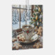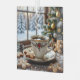 A pretty Christmas ornament with a warm cup of coffee with gingerbread men cookies, a window looking out to a winter day.