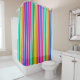 This shower curtain has a design of spring stripes in pink, yellow, orange, green, blue, and purple.