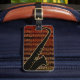 A pattern of musical notes on a grunge textured background in warm colour tones accents the black saxophone silhouette that sets off the foreground of this design. Personalize with your own name and/or other text on reverse.