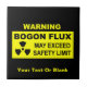 A black and yellow warning sign with text reading, "WARNING, BOGON FLUX, MAY EXCEED SAFETY LIMIT." A radioactive material warning symbol also appears. The bogon is an elemental particle which carries the property of bogosity, or being bogus (i.e., fake of bad). All humans are natural low-level bogons emitters. Emission levels fluctuate over time. Politicians, other individuals such as used car salesmen, are high level sources of bogons. When such individuals emit extremely high levels of bogons, as when making campaign promises, a bogon flux may occur. A bogon flux can be very dangerous to those in the area. Bogon was originally hacker jargon having to do with bogus addresses on a computer network.