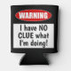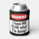 This funny beer can cooler or foam holder reads: Warning! I have NO CLUE what I'm doing! This fun can holder makes a great gift for the beer drinker in your life. Do you know somebody who (ahem) might have one too many upon occasion? If so, this can cooler is the perfect thing to make them laugh. Great for picnics, tailgates, parties, or any occasion.