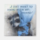 Waschbärbaby hängt an einer Jeans mit Spruch