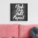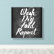 A fancy laundry room themed design. A chalkboard style sign which says wash, dry, fold repeat in a cute whimsical swirly font.