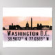 Art Print features Washington DC city skyline silhouette with watercolor splash and latitude & longitude map coordinates