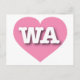 This postcard features a cool pink heart containing the bold white upper case letters WA, the official abbreviation for Washington, the evergreen state. The reverse side of the postcard is blank, awaiting your handwritten sentiments or customized text.