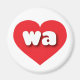 This magnet features a vibrant red heart containing the bold, white, rounded lower case letters wa, a playful abbreviation for Washington, the evergreen state.