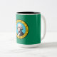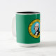 This design features the flag of the State of Washington, which is located in the Pacific Northwest region of the United States. It is named after George Washington (1732–1799), the first US president. Washington is often referred to as Washington State to distinguish it from the nation's capital, Washington DC. The flag depicts the state seal, which contains an image of state namesake George Washington, on a field of dark green. It is the only US state flag with a field of green; it is also the only state flag that contains the image of an American president.
