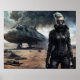 A woman with turquoise hair and a gas mask stands confidently in the foreground, dressed in a black leather outfit suggesting a post-apocalyptic setting. Behind her looms a large, weathered spaceship, supported by struts amidst a desolate landscape strewn with rubble and smoke.