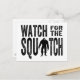 Grunge distressed style, large blocky letters warn other bigfoot hunters to Watch for the SQUATCH! A sasquatch creature himself is standing in the place of the A. Cool, simple black and white image works well on light, bright or medium dark coloured apparel.