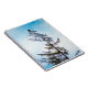 A photograph of an American Bald Eagle perched atop a tall Pine Tree. A blue sky with misty clouds are in the background. Traces of sunlight and snow can be found on the tree and it's branches.