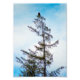 A photograph of an American Bald Eagle perched atop a tall Pine Tree. A blue sky with misty clouds are in the background. Traces of sunlight and snow can be found on the tree and it's branches.
