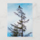 A photograph of an American Bald Eagle perched atop a tall Pine Tree. A blue sky with misty clouds are in the background. Traces of sunlight and snow can be found on the tree and it's branches.