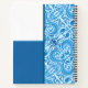 The artist's pattern design of water and waves is on the side of the notebook, front and back. On the other is a white and blue square with a blue line in the middle. And the texts can be personalized by the customer.