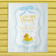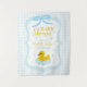 Baby blue gingham baby shower with a hand drawn bow. Water droplets frame a rubber duck surrounded by bubbles