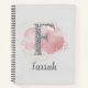 Pretty Initial / Monogram design features silver glitter letter F with abstract watercolor pink background and customizable text to add name or other message.