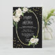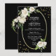 Personalize these vintage antique white floral style wedding invitations. Black background and white colours with faux gold foil ring. Hand painted watercolor white flowers (roses) with green leaves in a wreath shape. Back of card has bride and groom monograms / initials. Editable cards - add your info (text can be changed to any font, size, and colour). Perfect for any theme or time of year wedding party.