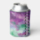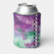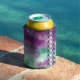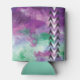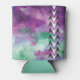 Purple, green watercolor can cooler with black and white arrowheads design.