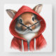 Watercolor art featuring an adorable brown rabbit wearing a red hoodie.