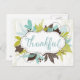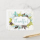 Watercolor leaves in olive green, browns, teal, and light aqua, with a wood - look background in white. Reads "Thankful" in a modern, stylish font over a bracket frame. Perfect for the thanksgiving holiday season or even for wedding thank yous!
