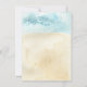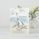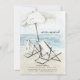 Beautiful watercolor tropical moving announcement featuring a beach chairs & umbrella set on a beach overlooking the ocean.