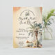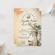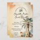 Elegant watercolor wedding invitations in moody vintage tones with a large palm tree, sign, and sunglasses.