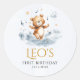Seal your party favours with charm using this watercolor bear first birthday sticker! Designed with a happy hand-painted teddy floating on fluffy clouds, golden stars, and playful musical notes, this round sticker adds a whimsical touch to your baby boy’s celebration. The pastel tones and soft textures make it a perfect match for a cozy, storybook-themed party.