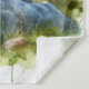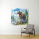 This is a tapestry with a bear on a rock surrounded by nature. It's a watercolor rendering.