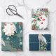 Set of three designs Christmas wrapping paper depicts a beautiful watercolor bird, lantern, pine cones, red and purple berries, winter leaves and holiday decorations.-