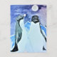This postcard features a watercolor painting of a cute pair of penguins beneath a starry Antarctica sky, with a background of icy glaciers.