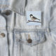 Pin-back button with my original digital watercolor illustration of a Black-capped Chickadee perched on a leafless twig against a pale blue sky.
